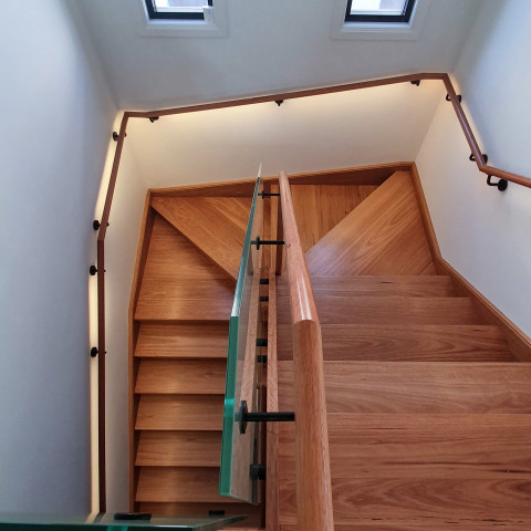 Constructed out of solid Blackbutt hardwood for longevity and to complement timber flooring throughout the home. This staircase is finished with frosted glass panel balustrades and satin black hardware, creating contrast with the timber.